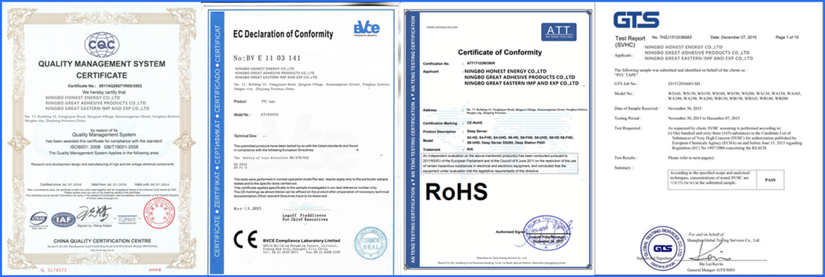 The company belongs to the Great group and has many sets of imported equipment, which greatly improves the output and quality improvement. Machines: 9 machine for producing PVC film 8 coating glue machines 20 automotive slitting machines 50 packing machines 10 drying machines 16 other testing machines Our daily production is 160, 000 pieces for PVC tape 1PC individual package, These modern production facilities guarantee that each of our tape before delivery is match the quality standard and we can deliver goods on time. Company staff: Research and development department: 5 persons Quality control department: 8 persons Production department: 84 workers Sales department: 6 salesmen Add other departments, total 126 persons We have a lab, including: 1 machine for testing voltage, our tape voltage resistance 6.5KV2 machines for testing strength, adhesion, and peeling strength 1 machine for testing glue make sure the tape in strong adhesive. 1 machine for testing flame retardant, FR resistance less than 5minutes. This laboratory make sure that we can make accurate sample customizations. If you have samples can send us, we can make 90% similar to your samples. We have certification ISO9001, RoHS AND REACH.